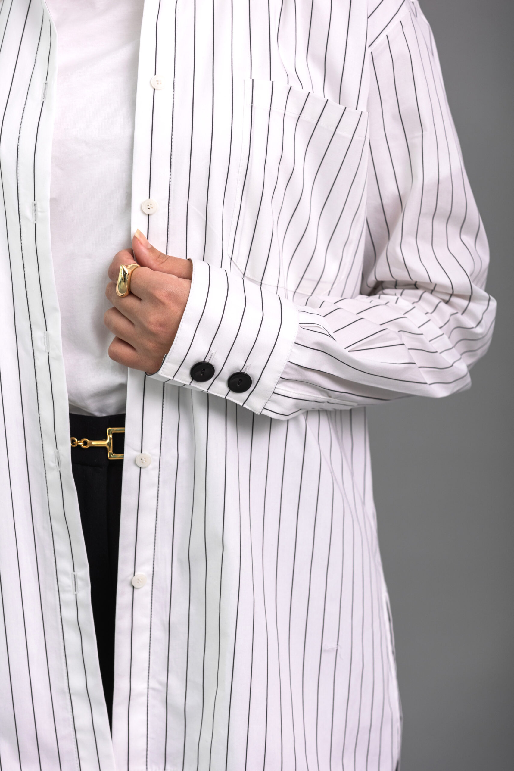 - Longueur des manches sur-taillée, double boutonnage au niveau des manchettes